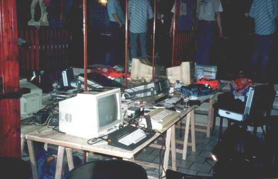 Die lange Arbeitsplatte mit Plus4, VC20, SX64 und einer Amiga-Station